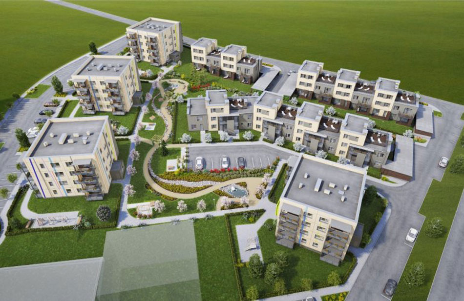 Projektuojami kelių tipų pastatai: dviejų aukštų su mansarda kotedžų tipo daugiabučiai su individualiais įėjimais ir keturių aukštų daugiabučiai su erdviais balkonais. Didžioji dalis projektuojamų butų bus funkcionalūs ir kompaktiški, o kotedžai – erdvesni ir su lanksčiai planuojamomis erdvėmis. Dalyje butų bus galimybė atskirti virtuvės zoną nuo svetainės. Gyventojų patogumui po namais suprojektuoti sandėliukai, o prie kotedžų bus įrengtos stoginės automobiliams.