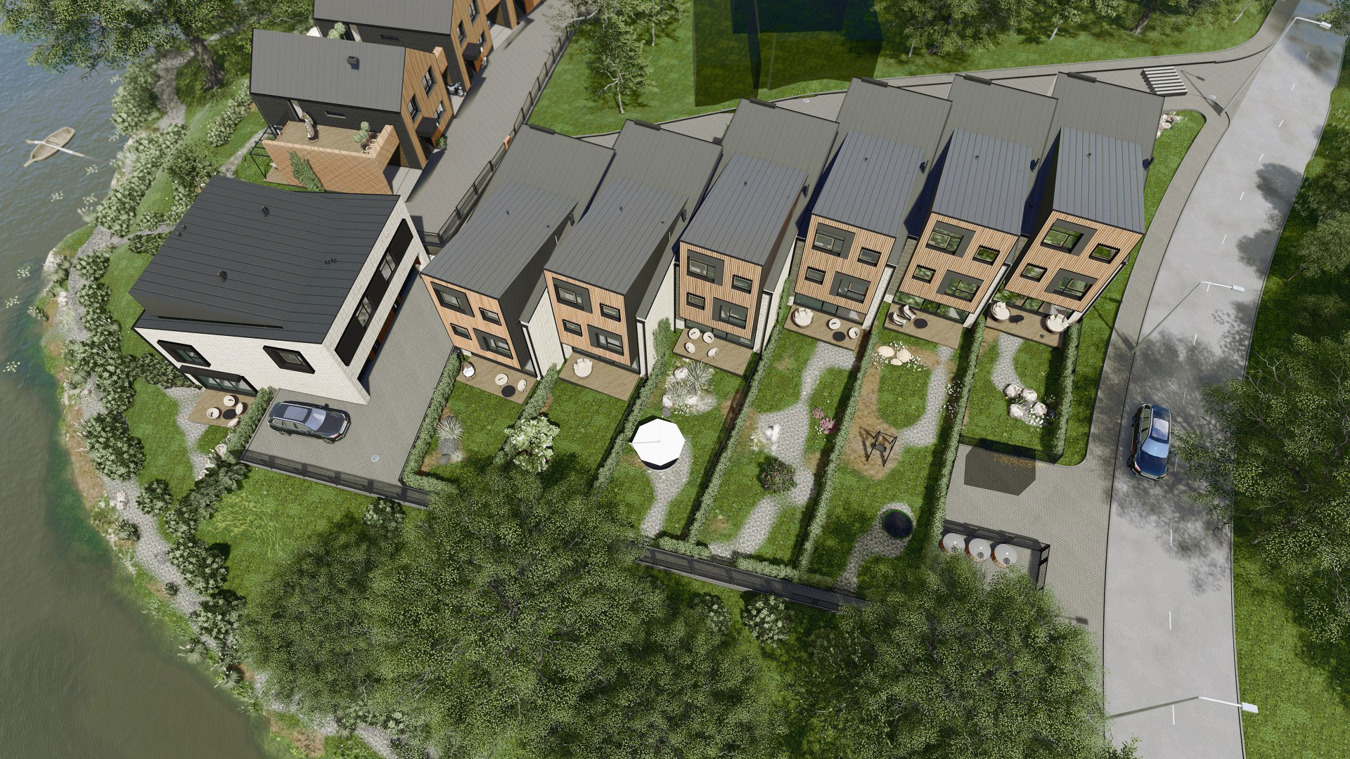 Visi namai su privačiais kiemeliais ir terasomis iš kurių atsiveria vaizdas į tvenkinį ir želdynus.
