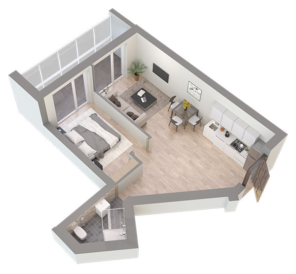 Pastatas suprojektuotas taip, kad maksimaliai išnaudotų netradicinę sklypo erdvę. Erdvių lodžijų dėka butai bus šviesūs ir šilti. Lodžijos įrengtos taip, kad ištisus metus pro savo namų langus galėsite stebėti augmenijos virsmą ir skirtingus metų laikus. Šoniniai butai specialiai suprojektuoti su vitrininiais langais iki žemės, kad į butą patektų kuo daugiau šviesos.