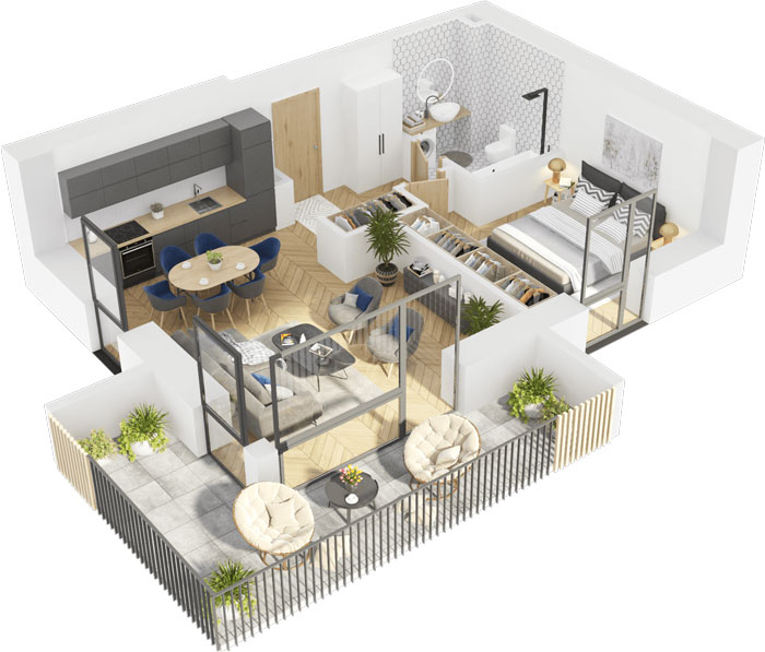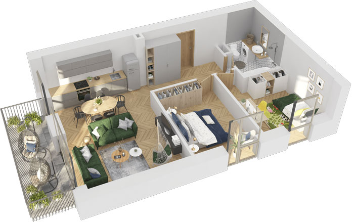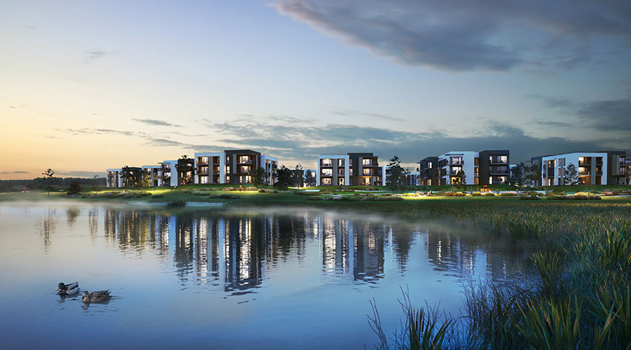 Gyvenvietės pastatų architektūra pastelinių spalvų, darniai įsiliejanti į supančią aplinką. Kurdami šią gyvenvietę galvojome apie žmogaus ryšį su gamta. Čia net 2ha bus skirti žaliosioms ir poilsio erdvėms palei išskirtinę sutvarkytą Gėlužės ežero pakrantę.