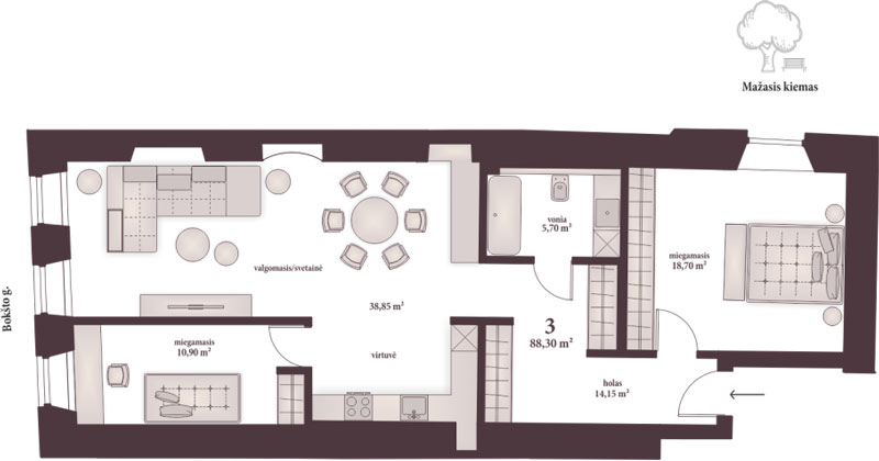 Uždaroje automobilių aikštelėje kieme ramiai paliekami automobiliai – kiekvienas buto šeimininkas gali įsigyti asmeninę parkavimo vietą.